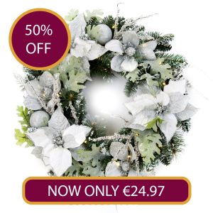 60cm White Silver Poinsettia Wreath Pre-Lit with 50 LightsRegular Price €49.95 Special Price €24.97 -